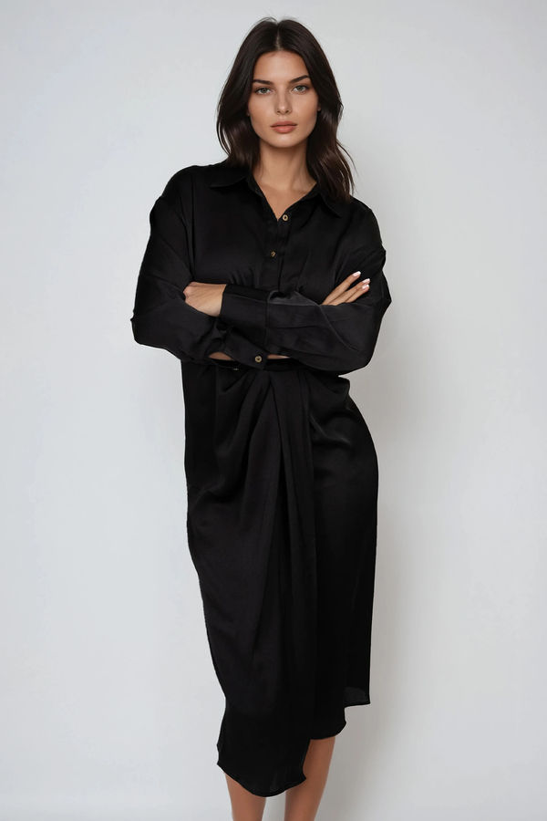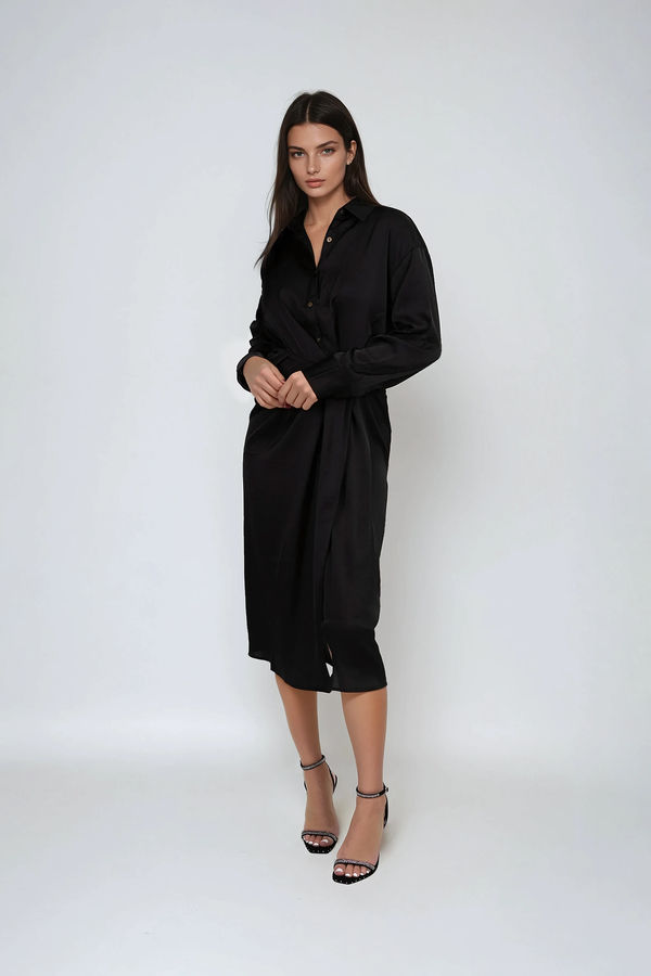 Bring effortless charm to any moment in the Good Days Satin Belted Midi Dress Black, perfect for garden parties, brunch dates, and daytime celebrations. Crafted from smooth satin with a flattering belted waist and a polished button-front design, it offers timeless elegance with a modern twist. Pair with block heels and delicate jewelry for a look that shines from sunrise to golden hour.
