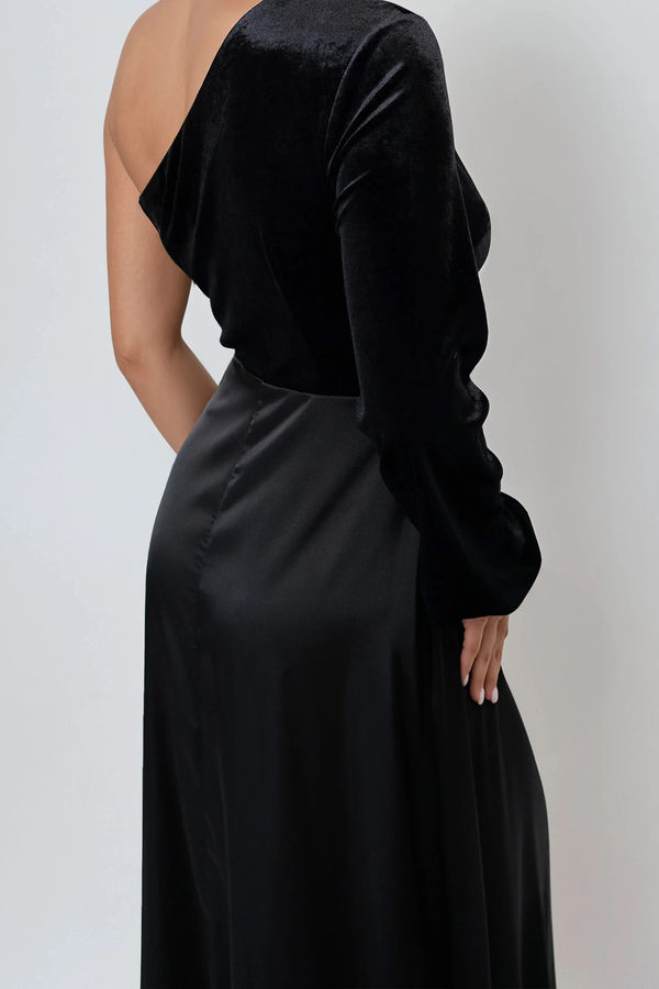 Bejeweled Velvet One Shoulder Maxi Dress - Black