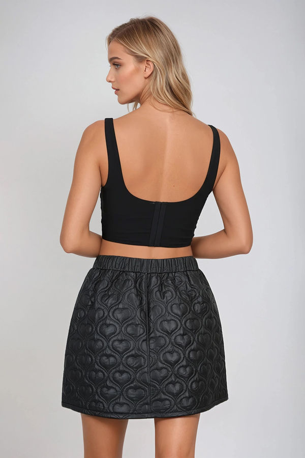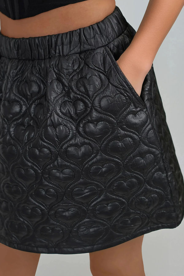 Fall head over heels for the Love Locked Leather Mini Skirt in Black. With its faux leather heart-quilted design and flattering high-waist fit, this skirt is all about mixing sweet with fierce. Dress it up with a sleek bodysuit or keep it cool with a cropped sweater—either way, it’s your new statement piece for stealing hearts and turning heads.