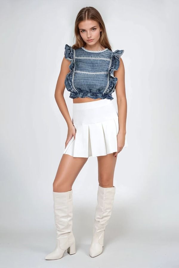 Bring effortless romance to your look with the Rustic Charm Ruffle Crop Top in Denim Blue. Designed with playful ruffled trim, delicate smocked details, and a cropped fit that flatters, this top blends sweet vintage vibes with modern flair. Perfect for festivals, brunch, or dreamy summer nights, it’s your go-to for instant boho chic. Pair it with denim or flirty skirts for a look that’s all charm, no effort.