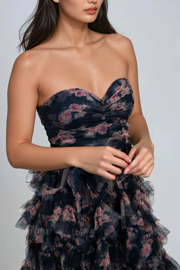 Let your style blossom in the Wildest Bloom Floral Ruffle Maxi Dress in Navy Pink. With a strapless sweetheart neckline, ruched bodice, and flowy ruffle tiers, it’s a stunning pick for formal weddings, evening garden parties, galas, and any event where elegance meets romance.
