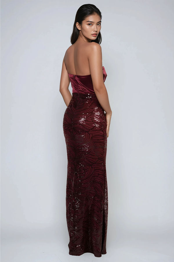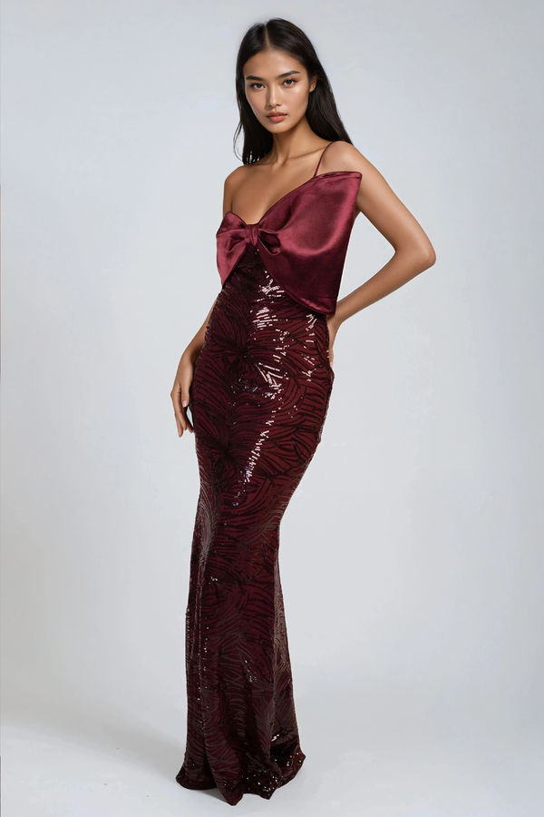 Bring the drama in the Glam Attack Satin Bow Maxi Dress in Burgundy. This head-turner features a sequin-patterned body, oversized bow front, and one sleek spaghetti strap for that asymmetrical wow-factor. With a zipper back and comfy stretch, it's made to flatter all night long. Perfect for weddings, galas, holiday parties—or any event where drama is welcome and sparkle is non-negotiable.