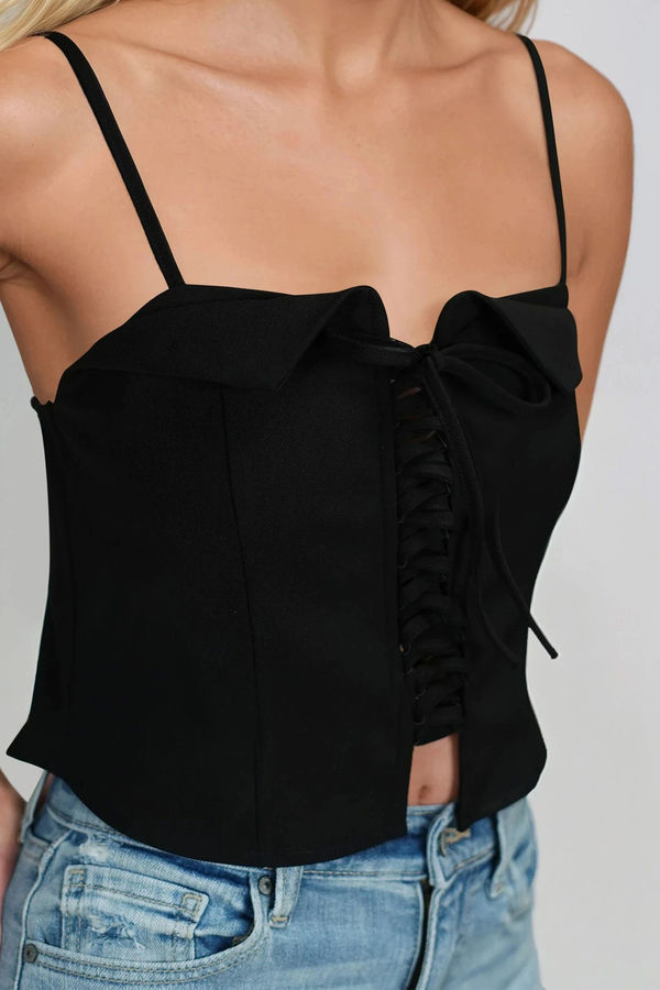 Step into irresistible style with the Divine Allure Lace-Up Corset Top in Black. Featuring a sultry lace-up front with bow detail, adjustable spaghetti straps, and a figure-flattering fit, this piece was made to make an entrance. The structured silhouette gives you that bold edge, while the playful tie detail keeps it flirty. Perfect for pairing with denim or skirts, it’s your go-to top for nights out, chic dinners, or any moment you want to shine.