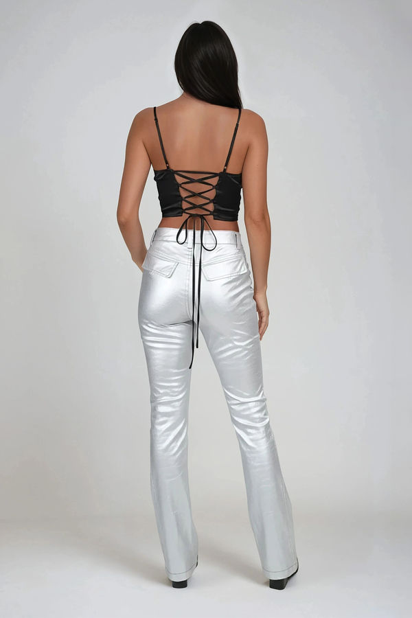 Cosmic Charm Metallic Flare Pants in Silver bring instant star power to your look. With their sleek high-rise fit and bold flared leg, these metallic pants are made to stand out. The coated finish catches the light from every angle, making them perfect for nights out, parties, or anywhere you want to shine. Pair with a sleek top and heels for a head-turning outfit that’s truly out of this world.