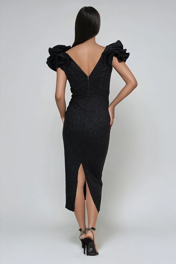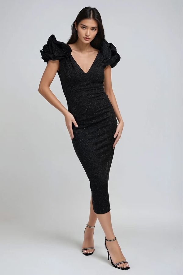 - Glitter ruffle shoulder midi dress