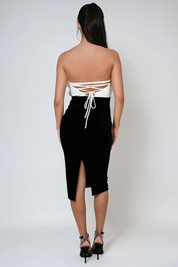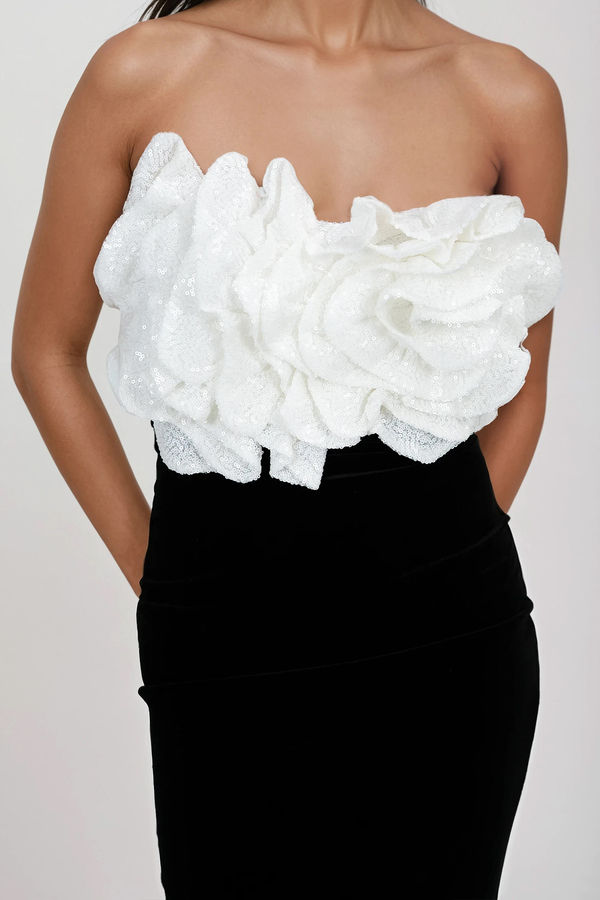 Fall in love with the Velvet Crush Sequin Floral Midi Dress in White/Black. Featuring a 3D sequin flower bodice, soft velvet contrast skirt, and a criss-cross ladder back with self-tie detail, this strapless stunner is made to wow. The zipper back keeps things sleek. Perfect for cocktail parties, weddings, or any night that calls for bold romance and unforgettable style.