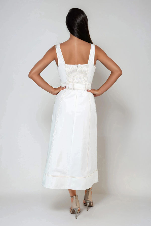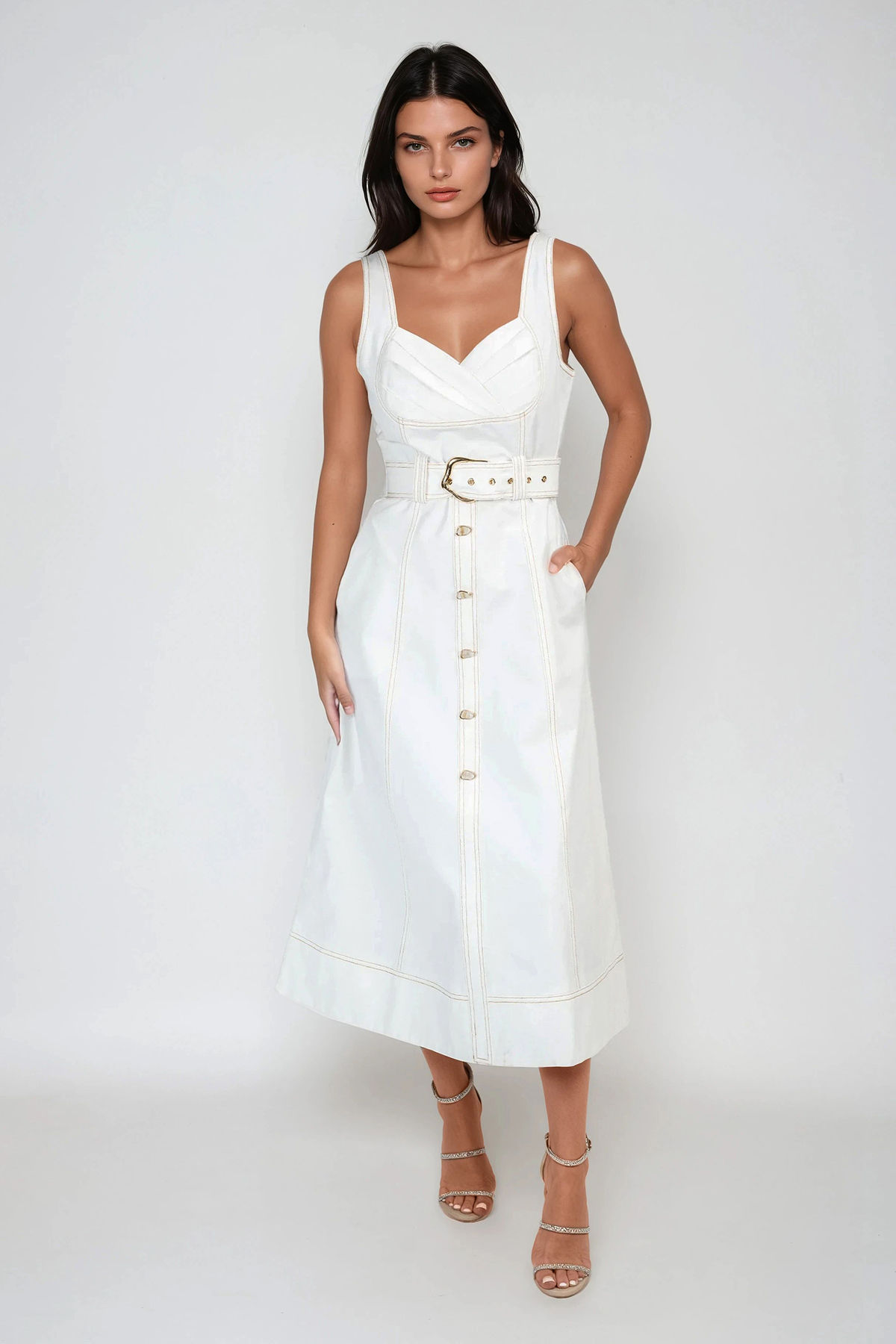 Polished with a punch, the Got The Edge Belted Button Midi Dress White is perfect for rooftop dinners, creative meetings, or weekend strolls. It features a sweetheart neckline, wide tank straps, and a bustier-inspired bodice for a sculpted fit. Contrast stitching, a belted waist, and a front button closure bring the attitude, while hidden back zip and side pockets keep it functional. Sleek, structured, and effortlessly cool.
