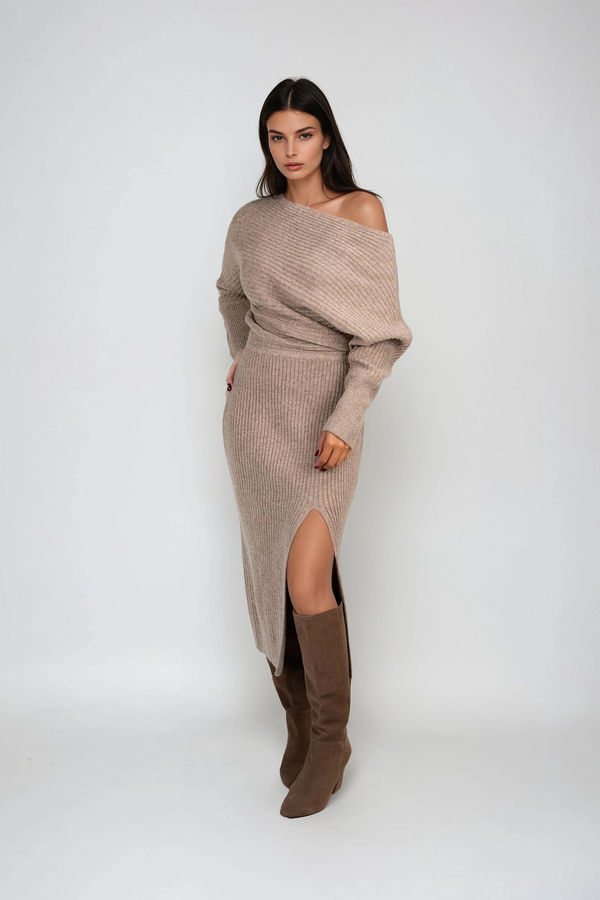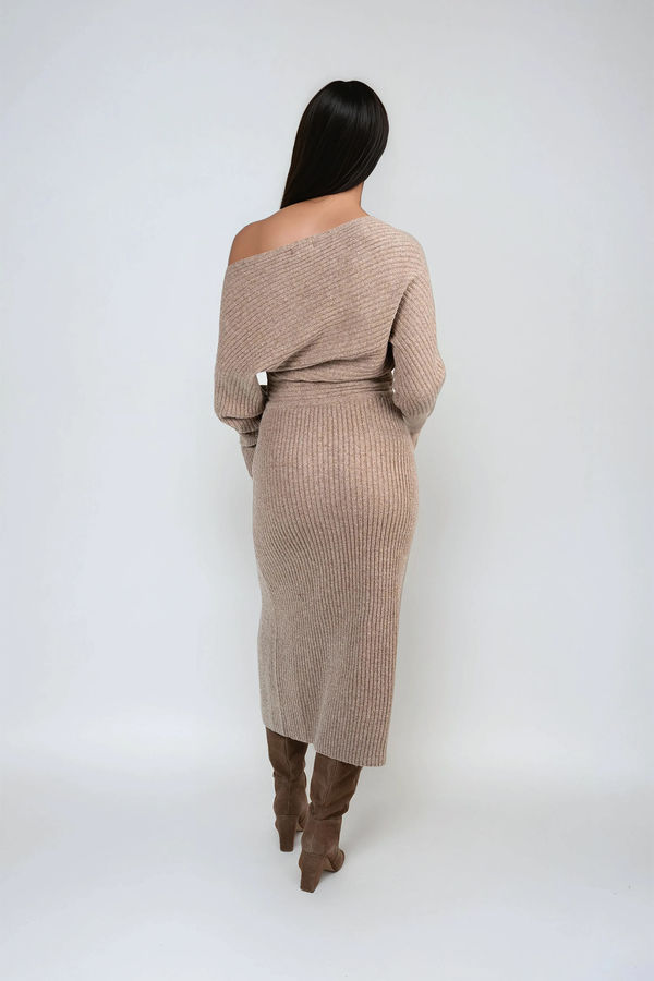 Winter Luxe One Shoulder Sweater Midi Dress - Latte