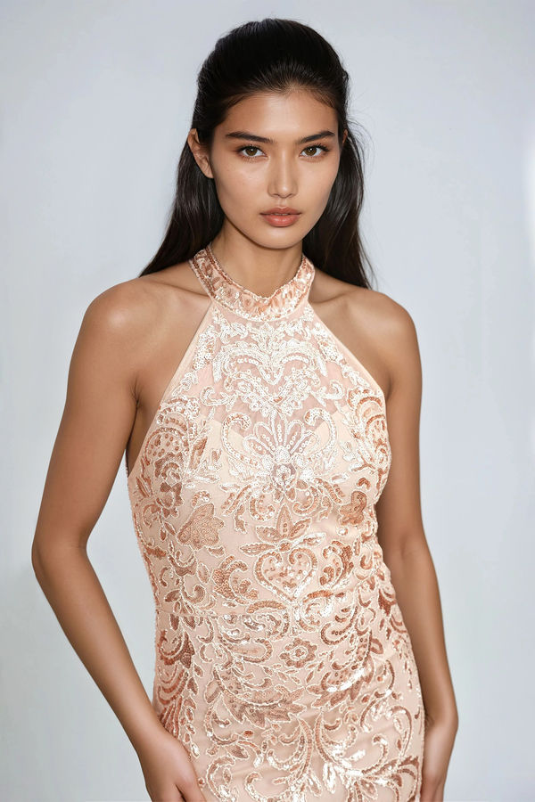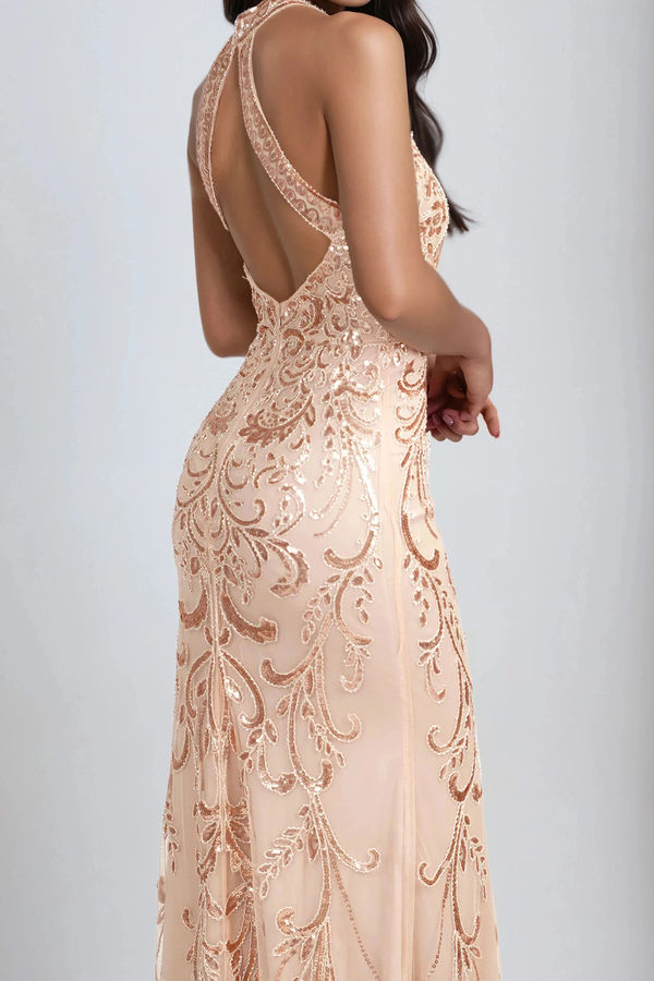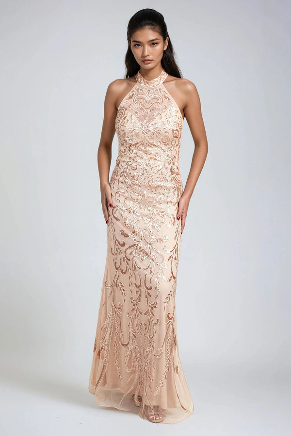 Dazzle like royalty in the Luxe Majesty Embroidered Sequin Maxi Dress - Rose Gold. Designed with an intricate embroidered sequin pattern that catches the light from every angle, this high-neck silhouette exudes elegance with a curve-hugging fit. The open back adds allure, while the flowing midi length keeps it timeless. Perfect for galas, weddings, or any night you want to shine with regal sophistication.