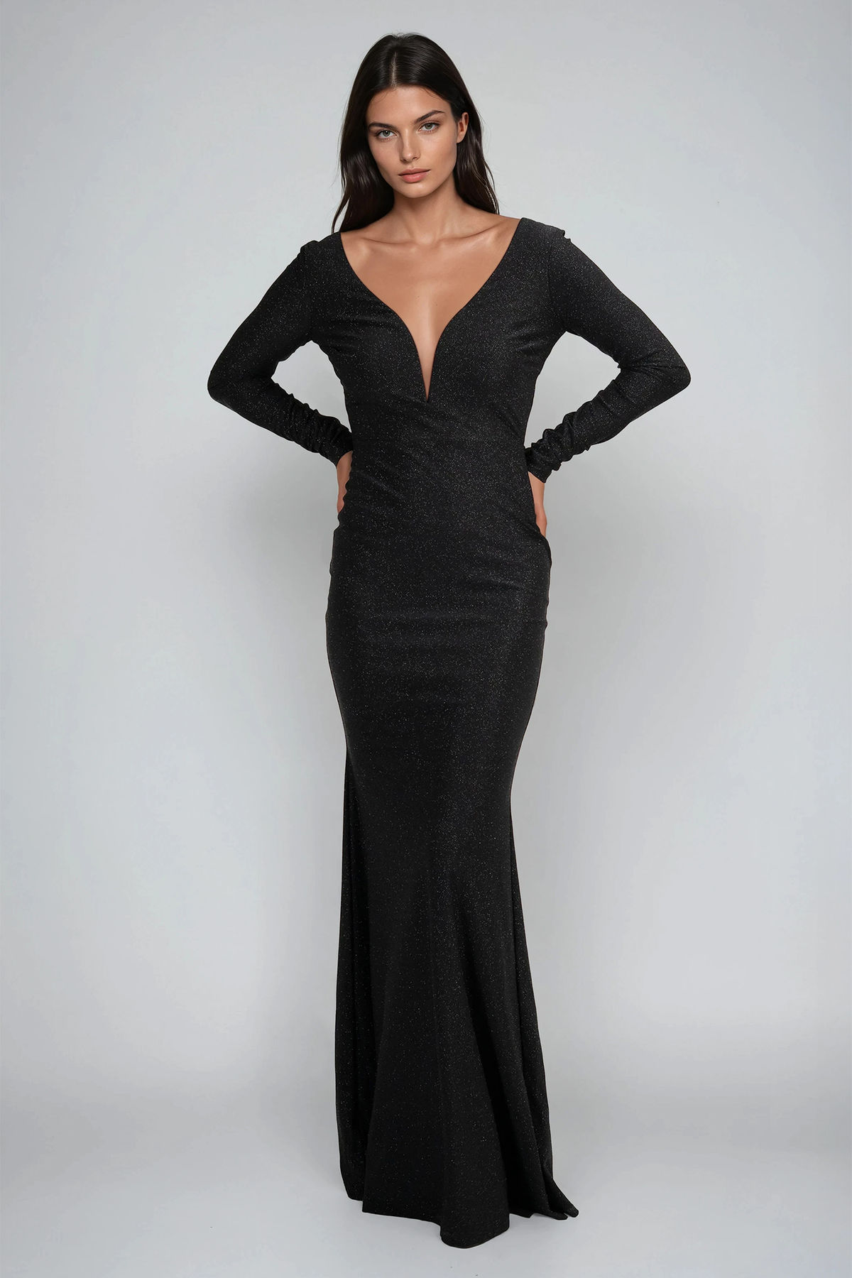 Own the night in the Dark Desire Glitter Open Back Maxi Dress in Black. Featuring a sultry V-wire neckline, shimmering stretch fabric, long sleeves, and a dramatic open back with a strap—this dress is pure magic. Slip it on for galas, winter weddings, or any night that calls for unforgettable glam.