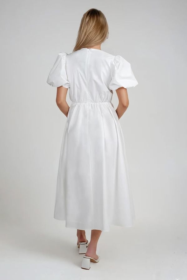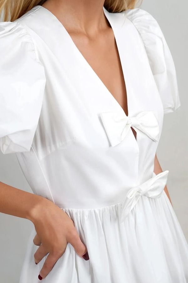 Sweet with a little sass, the Sweet But Sharp Puff Bow Midi Dress White is made for bridal showers, garden parties, or any moment you want to charm and stun. It features a plunging neckline with flirty cutout, two statement front bows, and voluminous puff sleeves for a playful silhouette. The gathered waist flows into a breezy midi skirt, while the back has a zip closure and slight elastic for comfort. It’s femininity—turned up with edge.