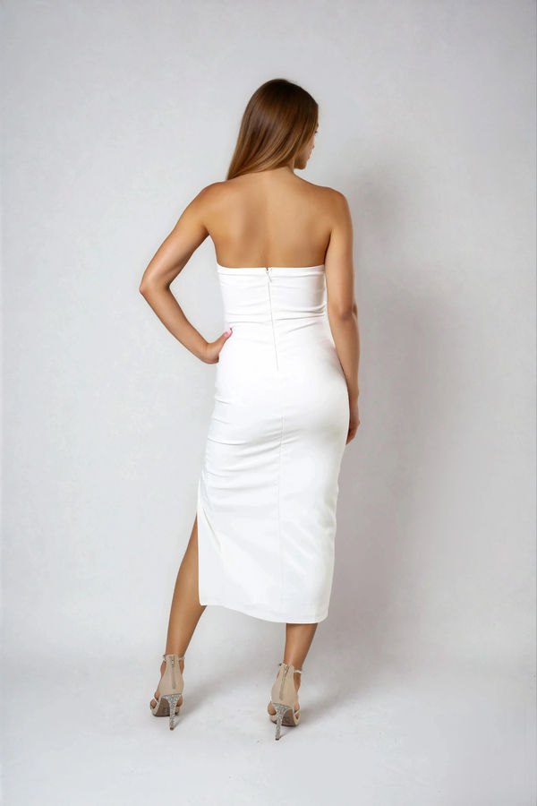 Steal the spotlight in the Paint The Town Hook Slit Mini Dress in Off White. This halter bodycon stunner features a plunging neckline with a sleek metal hook, illusion mesh paneling, and a dramatic thigh-high slit. The back is strapless and fitted with a zipper closure for a clean, open finish. Perfect for nights out, club dates, or dancing with the girls—this is your go-to for turning heads and breaking hearts.