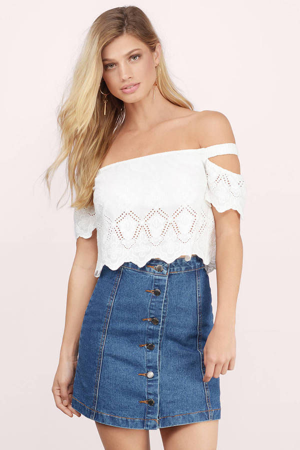 Turn up the heat with the Sunset Beach Crop Top in Ivory! This eyelet beauty features off-the-shoulder design with detachable sleeves for a versatile look. Its cropped waist and flowy body create an effortlessly chic silhouette. Pair it with slim or wide-legged jeans for the perfect laid-back yet stylish vibe. Ideal for sun-filled days and cool nights!