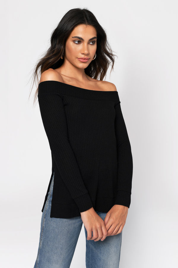 Ready for it all in the Hazel Off The Shoulder Top in Black. An all-weather essential to add to your basics, this basic long sleeve tunic features an off the shoulder neckline, long tight sleeves, and a special side-splitting hem. Designed with a comfy thermal material, this bardot top goes perfectly well with distressed jeans and boots.