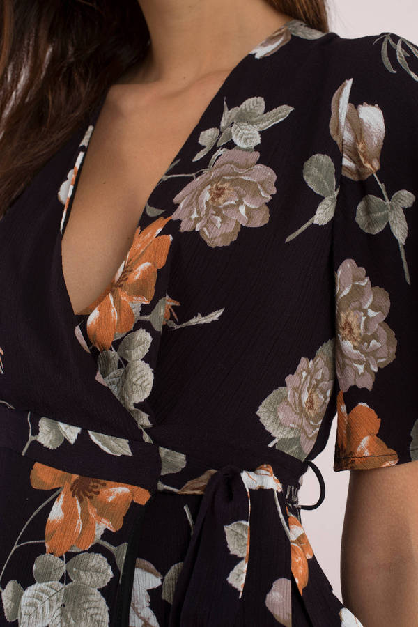 Floral print midi dresses: still a thing. Whatever the season, you'll love the Black Spring Fling Floral Wrap Dress. This high low floral dress has a v neckline with half length flutter sleeves and tie at the waist for definition. Add booties to this wrap dress to bring it into fall.