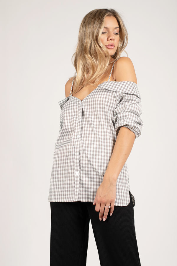 Plaid makes perfect when it comes to work looks this fall. We updated the button down to create the White Multi Don't Be Plaid Top, a work top with an off shoulder neckline and gathered half sleeves. With narrow black pants, this button up plaid top makes Monday mornings bearable.