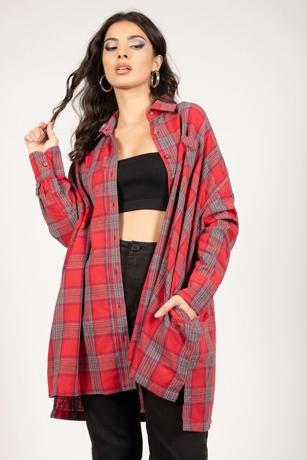 Cozy up in the Plaid To The Bone Button Up Top in Red. This oversized button up tunic is better than your average flannel. Wear tucked in with mom jeans and combat boots for a rustic look, or wear as is for a relaxed lounging 'fit.