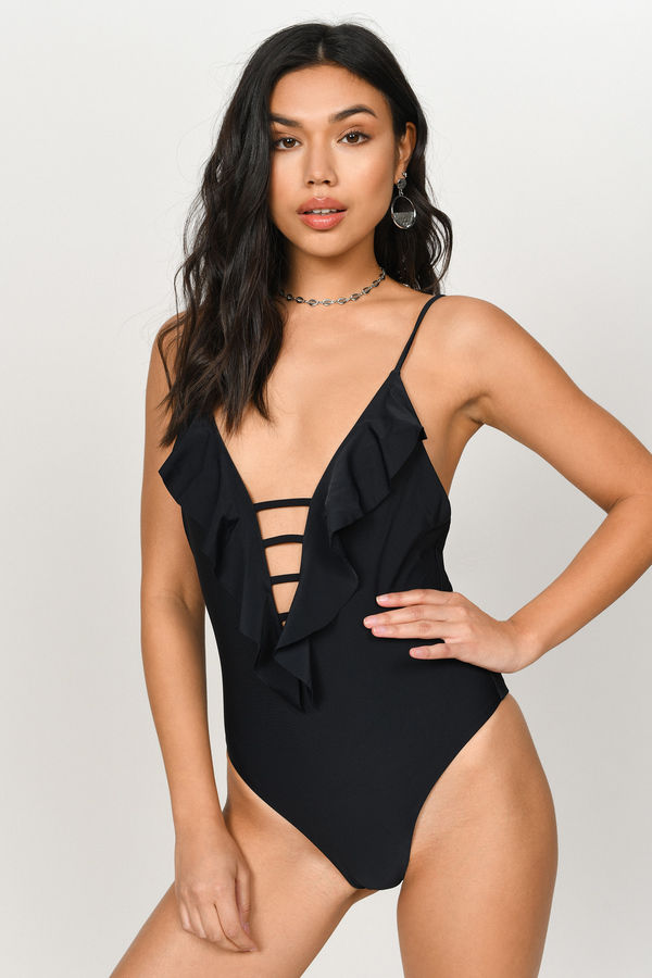 Plunge neck swimwear with frills on: no wonder we're swept away. You'll love the Black Swept Away Plunging Ruffle Monokini, which makes the most of its plunge neckline with ladder straps and a ruffle trim. Add your fave shades to this frill swimsuit and be dazzling.