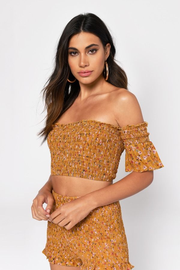 Rock your next sunny outing in the Marigold Double Time Tie Back Crop Top! This off-shoulder beauty features a playful ditsy floral print, a smocked bodice and sleeves, and two tie-back details for a secure, yet breezy fit. Pair it with matching smocked shorts for a cute, carefree vibe at picnics or patio parties—your new go-to for warm weather fun!