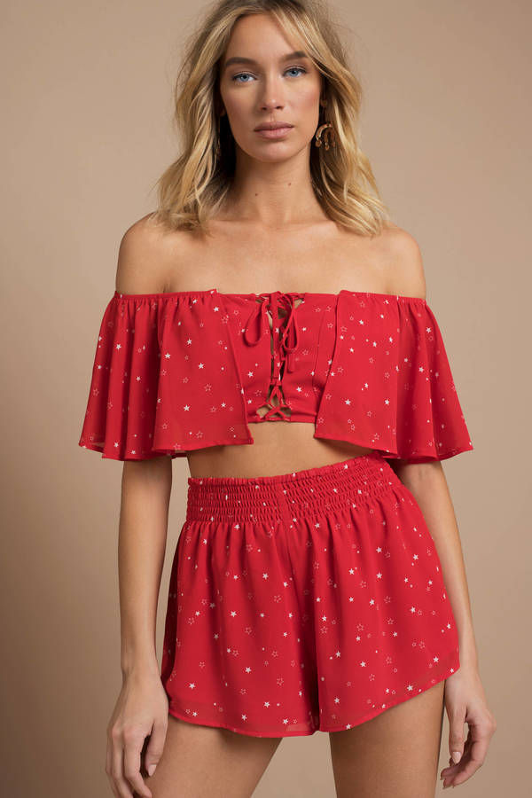 Bring the sparkle to every moment with the Whitney Crop Top in Red Multi! This off-shoulder beauty features lace-up ties and a large ruffle around the back, adding a playful twist to your look. Sprinkled with a star print, it’s perfect for beach days and BBQs. Pair it with the matching shorts and let your star power shine brighter than ever!