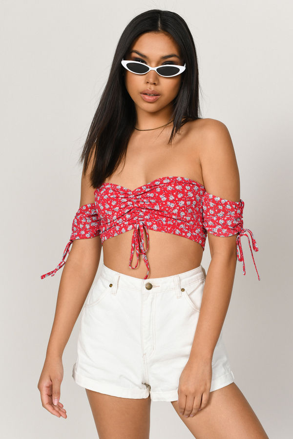 Rock the festival season in the Denise Crop Topin Red Multi! This bandeau style features short sleeves, center front gathering, and a chic tie detail, while the off-shoulder neckline gives you all the tanning opportunities. Perfect for a day at the festival or by the lake, this top doubles as a red bandeau bikini, ready for you to take the plunge in style!