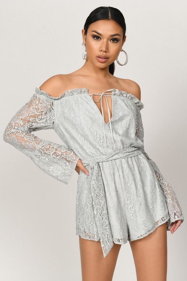 Romance begins with the All Yours Dusty Mint Lace Off The Shoulder Romper. This romantic lace romper features a gorgeous front tie, front keyhole, and alluring bell sleeves. Save this evening romper for a special night out – or in.