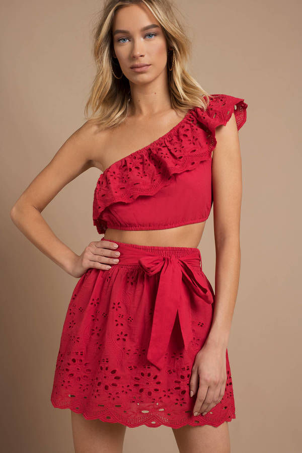 Slay your day-to-night look with the Kyla Crop Top in Red! Crafted from soft cotton, this crop features a flattering elasticated hem and a beautiful eyelet lace ruffle that drapes over one shoulder. Designed for festive days, pair this ruffled beauty with the matching skirt and heels for a fun, flirty, and effortlessly chic outfit that's ready to party!