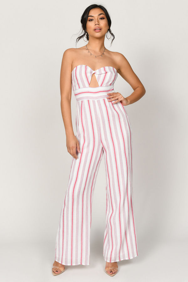 Who's the freshest of them all? It's you in the Carrie Strip Strapless Jumpsuit! Featuring a no grip slip, front cut out, fitted waist, and flowy wide pant legs on a lightweight rayon weave.