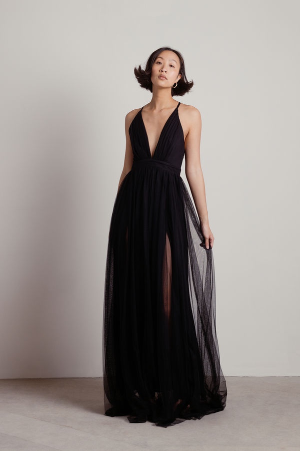 Midnight Hour Black High Slit Mesh Paneled Maxi Dress