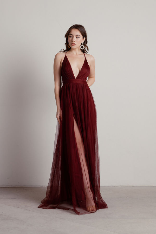 Description Dare to be bold in the Here To Slay Plunging High Slit Maxi Dress in Wine! With a striking plunging V neckline and a sophisticated pleated halter, this dress is all about making a statement. The airy, sheer skirt flows beautifully around you, while the thigh-high slit brings a touch of flirtiness to your ensemble. Pair it with chic ankle boots and layered jewelry to channel your inner goddess at any evening event!