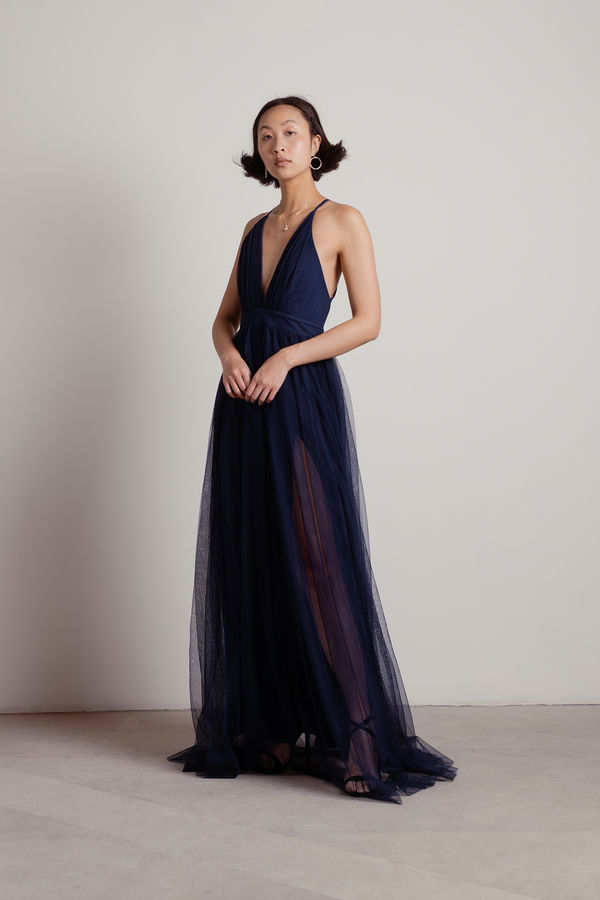 Dare to be bold in the Here To Slay Plunging High Slit Maxi Dress in Navy! With a striking plunging V neckline and a sophisticated pleated halter, this dress is all about making a statement. The airy, sheer skirt flows beautifully around you, while the thigh-high slit brings a touch of flirtiness to your ensemble. Pair it with chic ankle boots and layered jewelry to channel your inner goddess at any evening event!