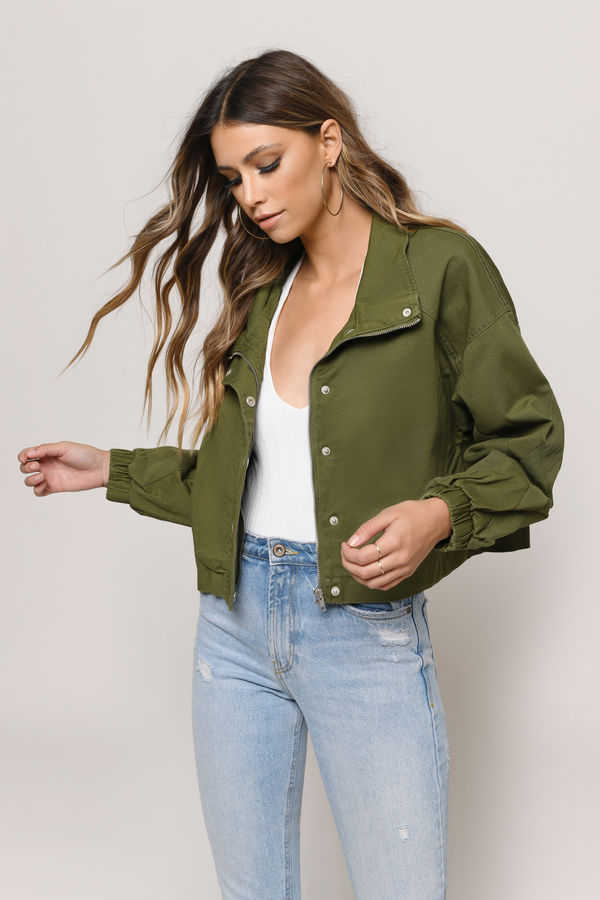 Keep things casual-chic Off Duty Olive Cargo Jacket. This cropped bomber jacket features relaxed sleeves, front zipper, button details, and cute collar. Pair this short cargo jacket with ripped denim jeans and boots.