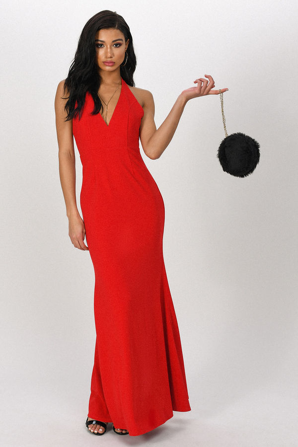 Indulge in all things glam with the Hailey Backless Mermaid Maxi Dress in Red This formal evening gown features a halter neckline, open back, and a beautiful flared skirt. Make an entrance in this backless gown, and pair it with simple heels and statement earrings.