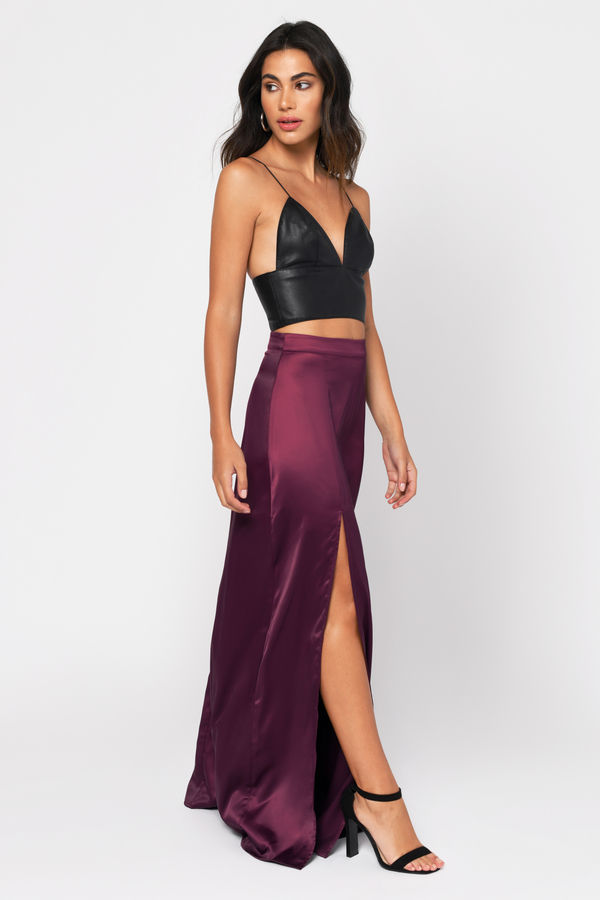 Here's a tall order of satin comin' your way. Wear the All Of Me Wine Satin Maxi Skirt at your next semi-formal event. This side split maxi skirt features a high waisted construction, satin finish, and a sexy thigh high slit. Pair this elegant skirt with a formal crop top and peep toe heels.