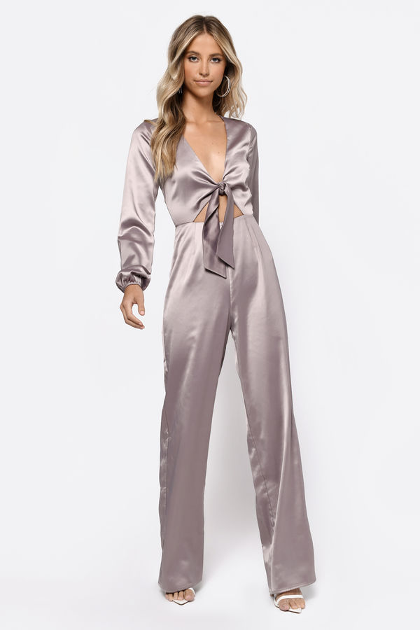 This satin jumpsuit is looking to party. The Mila Taupe Front Tie Satin Jumpsuit features long relaxed sleeves, v-neckline, front tie, front cut out, and flared legs. This flare leg jumpsuit will look great with an up-do and statement earrings at your next soiree.