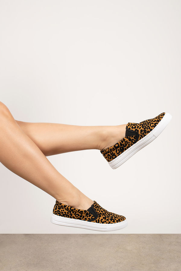 Ssssslip into snakeskin. Let the Gemma Camel Leopard Snakeskin Slip On Sneaker finish off all your casual 'fits. These slip on sneaks feature elastic panels on the side for a snug fit, rubber sole, and the most comfortable fit. Pair these animal print shoes with leggings and an oversized tee.