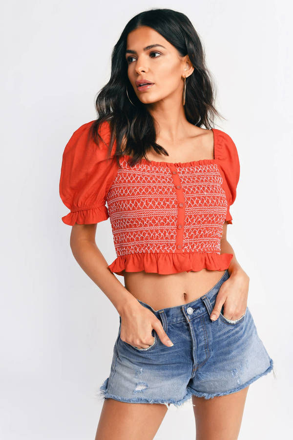 Get ready to sip in style with the Lost + Wander Bloody Mary Crop Top in Red! This playful crop top features a smocked bodice for a flattering fit, with charming ruffle details and non-functional button trim adding a touch of whimsy. The puff sleeves complete the look with a fun, flirty flair. Perfect for pairing with your favorite high-waisted jeans or skirts, this top is your go-to for turning heads and enjoying a fabulous, fun-filled day!
