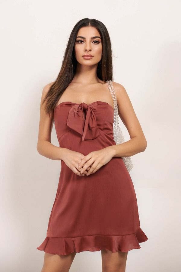 Unveil your chic side with the Sweet Nothings Front Tie Satin Mini Dress in Terracotta! This dress combines luxurious satin, elegant bust boning, and an adjustable front tie for a look that's both stylish and comfortable. With a keyhole neckline and invisible back zipper, it's perfect for creating a standout impression. Shine bright at every occasion!