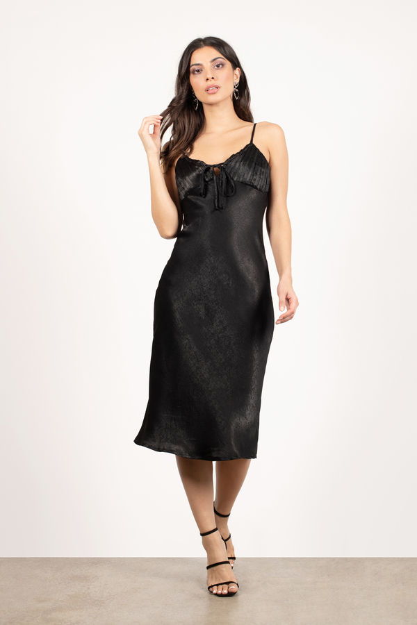 Slide into sophistication with this Come Get Me Satin Front Tie Midi Dress in Black! Featuring adjustable shoulder straps and a cute front tie detail, this dress ensures a perfect fit. The side zipper closure and full lining add comfort and elegance. Whether for a special event or a chic day out, this satin beauty is your go-to for a stylish statement!