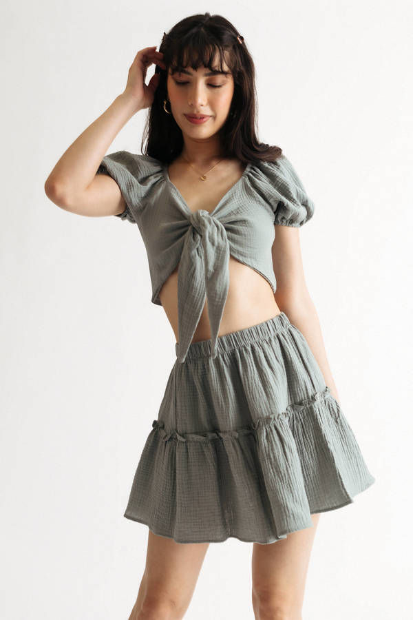 This coordinating Lesly Puff Sleeve Skater Set in Sage Blue is perfect for vacation-ready style. With its tiered skirt and tie front top, this set is a boho-chic dream. The puff sleeves give it a girly touch that's irresistible. Style this set with sandals and a sunhat for an effortlessly chic look. Whether you're brunching with friends or spending the day at the beach, this set has you covered.