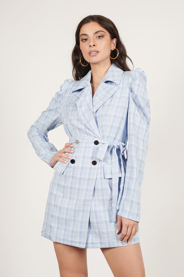 Step into the future of chic with the Future Wave Belted Blazer Mini Dress in Light Blue! This modern twist on the classic blazer features a tailored fit with puff sleeves, double-breasted buttons, and a tie waist for a flattering silhouette. The plaid pattern adds a playful yet polished touch, perfect for both power moves at the office or cocktails afterward. With Future Wave, you're always ahead of the fashion game!
