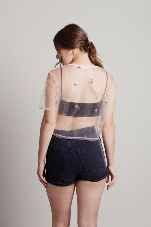 Sparkle and shine with the Starry Night Crop Top in Cream! Adorned with dazzling metallic and sequin stars, this sheer, see-through top is designed for those who love a touch of stardust. The unlined design adds a hint of daring allure, making it perfect for layering or wearing solo. Get ready to light up the night and make every moment a stellar one!