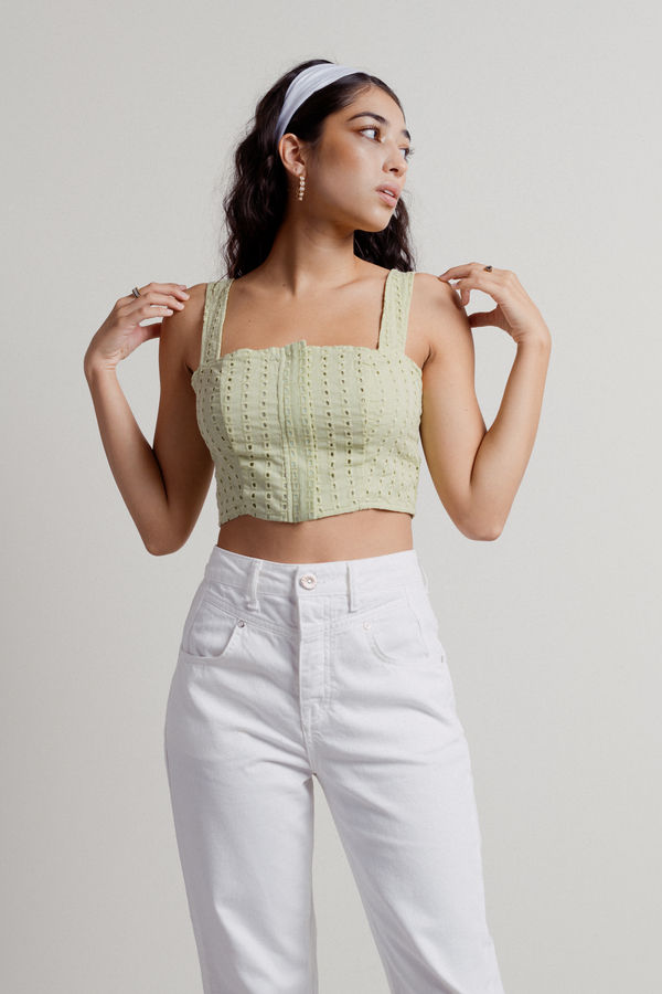 Add a splash of zest to your style with the Lemon Lime Crop Top in Light Green! This eyelet crop top is a refreshing burst of fun, featuring a hidden front zipper closure for a sleek finish. Whether you're out for brunch or hitting the town, its playful design and chic details make it the perfect choice for a standout look. Shine bright and keep cool with this juicy fashion pick!