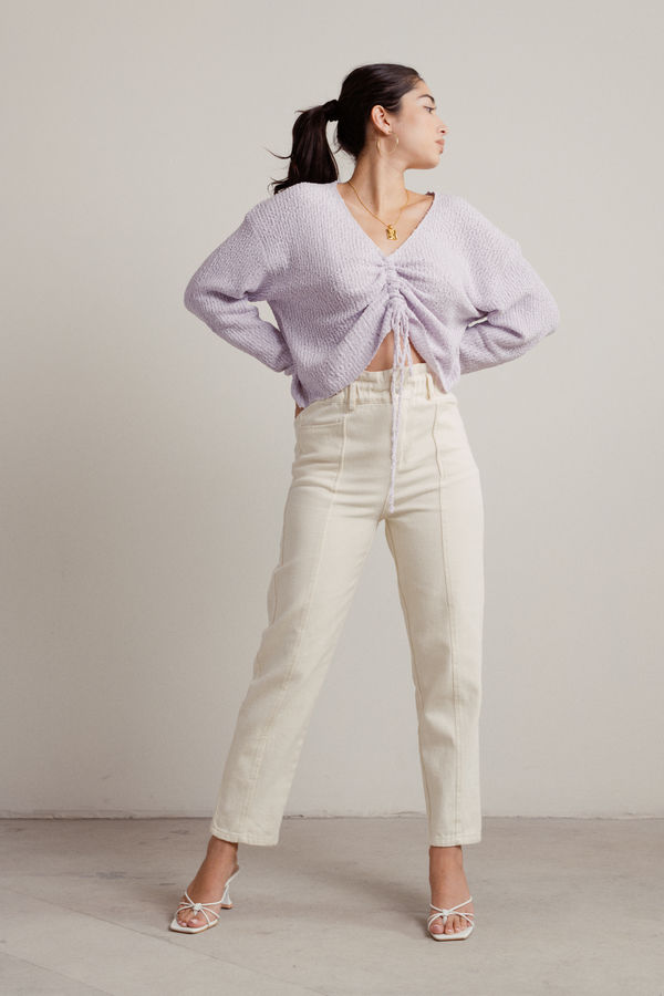 Wrap yourself in cozy chic with the Deianira Ruched Sweater in Lavender! Featuring adjustable front ruched ties, this sweater lets you play with the fit for a look that's uniquely yours. The soft fabric and fun detailing make it perfect for both lounging and layering, adding a stylish twist to your everyday outfits. From casual days to cozy nights, the Deianira Sweater blends comfort and creativity, making you feel fabulous every step of the way!