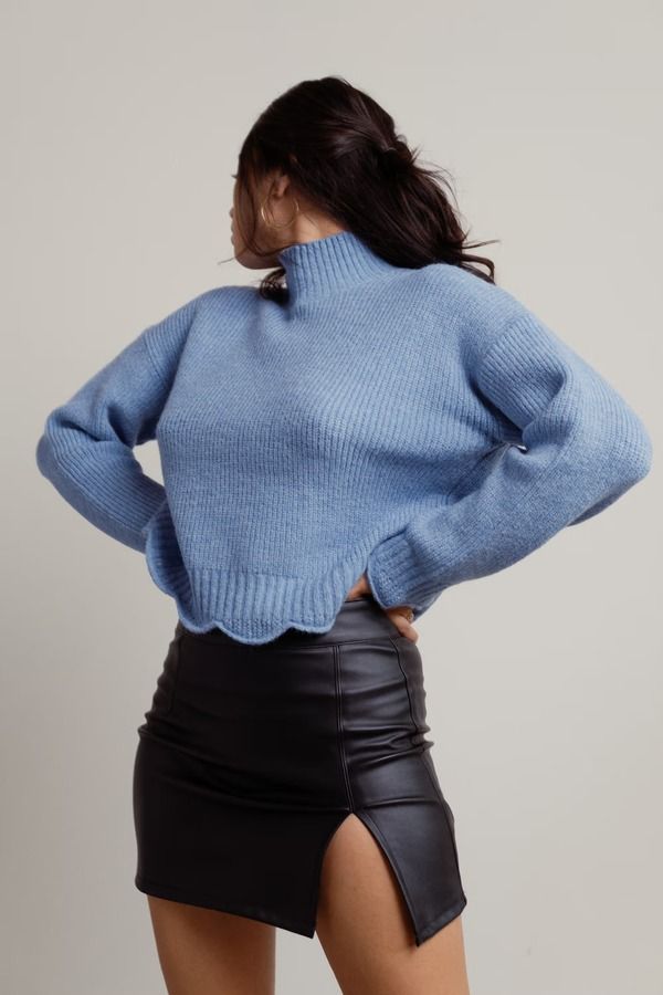 Stay warm this autumn and winter in the Extra Passion Ribbed Sweater in Blue. This Blue mock neck sweater offers a lettuce hem and warm knit material. Complete the look with a faux leather mini skirt and ankle boots for a chic look for the cold months
