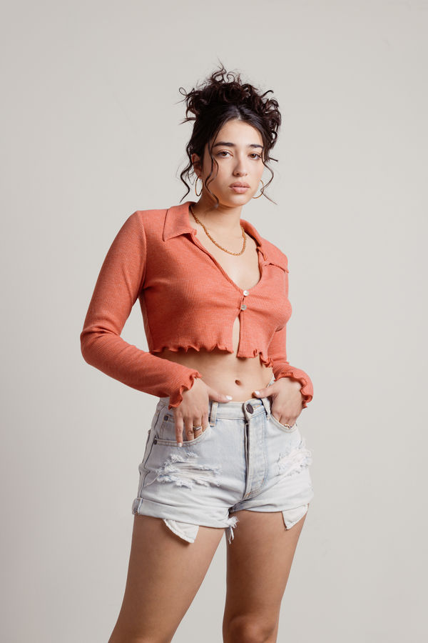 Add a touch of glam with the Silver Crop Top in Dusty Red! Featuring a playful lettuce hem, a sleek collar, and a buttoned front with a daring center slit, this top is designed to make you shine. Ideal for any occasion where you want to sparkle and stand out, it blends fun and sophistication effortlessly. Get ready to dazzle and let your style steal the spotlight!