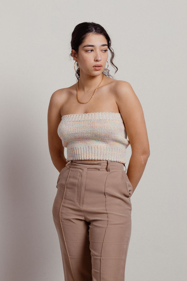 Sweeten up your wardrobe with the Sugar Lollipop Sweater Knit Tube Top in Rainbow! This adorable top combines cozy sweater knit fabric with a playful tube design, making it perfect for any season. The soft, stretchy material hugs your curves for a flattering fit, while the vibrant colors add a pop of fun to any outfit. Pair it with high-waisted jeans or a skirt for a cute and casual look that's sure to turn heads.