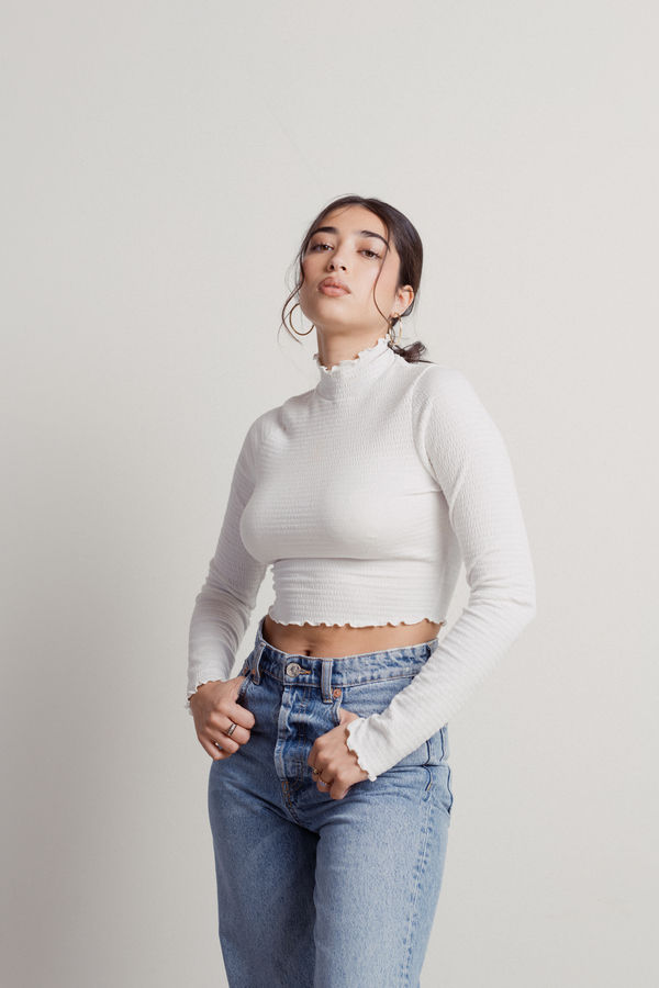 Add a touch of charm to your wardrobe with the Fortunate Crop Top in White! Featuring a cute lettuce hem, stylish mock neck, and long sleeves, this smocked crop top offers a playful yet chic look. Perfect for pairing with high-waisted jeans or a skirt, it's a versatile piece for any casual outing. Get ready to turn heads and feel fabulous in this trendy top!