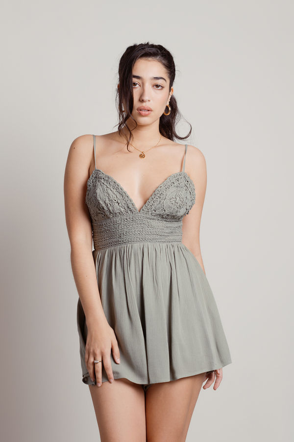 Go to brunch in the Sea Breeze Lace Tie Back Romper in Green. This romper features adjustable shoulder straps, a back cutout with adjustable tie closures, and an elastic trim at the back waist. This backless romper is easy to throw on and go for dates, graduation, or vacation.