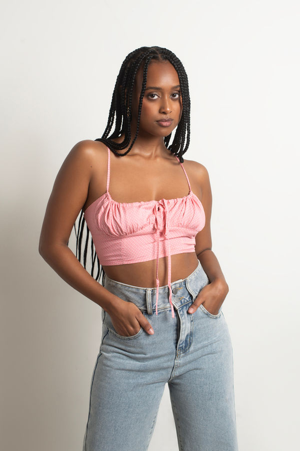 Get your flirt on in the Mimas Crop Top in Pink. This bustier crop top features a sweetheart neckline, keyhole details, and adjustable front ties. Pair with white high waisted pants and heels for a cute outfit for brunch or casual days out during the summer.
